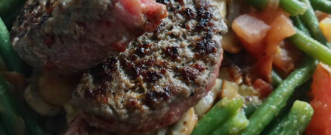 Kook de haricots verts zo’n 4-6 minuten (zeker niet langer!). Bak in de tussentijd de champignons en gesnipperde ui (eventueel met wat water) bruin. Schep regelmatig om om te voorkomen dat het te hard gaat. Snijd vervolgens de tomaten in blokjes en bak deze kort aan met een teentje knoflook. Giet de haricots verts af en voeg toe aan de tomaat. Zet het vuur laag en voeg (indien nodig) een eetlepel water toe. Kruid de tartaartjes met wat verse peper en grill in 2 minuten aan beide kanten gaar. Doe er op het laatst naar smaak wat sambal bij (eventueel met beetje water). Laat de tartaartjes vervolgens een minuut rusten in aluminiumfolie en verdeel in de tussentijd de haricotssalade over 2 borden. Schep de champignons en ui ernaast en als laatst het tartaartje. Geen haute cuisine, wel gewoon heel lekker!