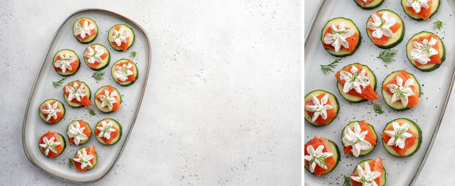 Frisse komkommer bites met gerookte zalm en roomkaas
